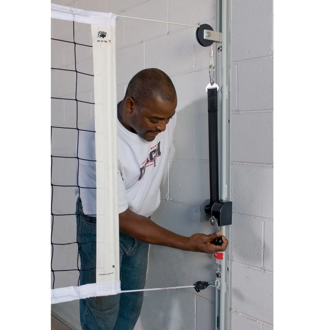All the features of Bison’s popular Match Point systems on a convenient track system. Track system mounts to customer’s supplied posts, walls or any surface strong enough to support desired net tensioning.