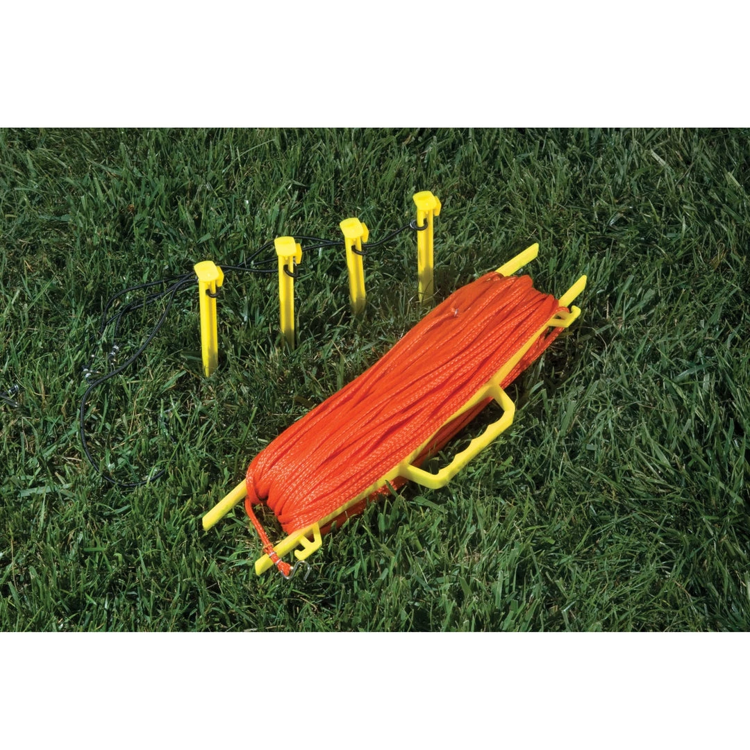 - Includes storage reel and corner stakes