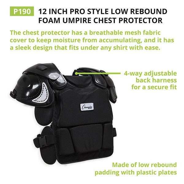 Keep your umpire feeling safe during even the most intense games with this Champion Sports 12″ Pro Style Low Rebound Foam Umpire Chest Protector. It has plastic plates and low rebound foam padding to absorb impacts from foul balls, and the four-way harness at the back adjusts to hold it securely in place. The chest protector has a breathable mesh fabric cover to keep moisture from accumulating when the action picks up, and it has a sleek design that fits under any shirt or sleeve with ease.