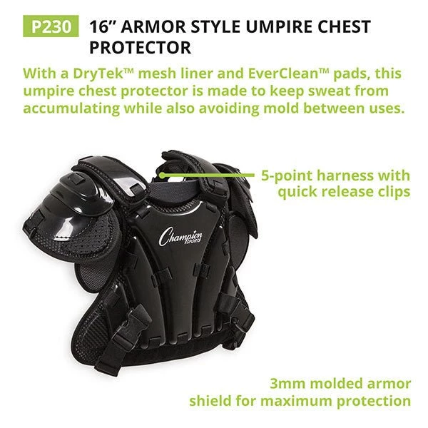 Designed for maximum protection and comfort, the Champion Sports 16 Inch Armor Style Umpire Chest Protector features 3mm molded armor and is contoured for a perfect fit. With a DryTek™ mesh liner and EverClean™ pads, this umpire chest protector is made to keep sweat from accumulating in an umpire’s gear while also avoiding mold, mildew, and bacteria between uses. With a five-point harness and quick release clips, this chest shield offers comfort and convenience.