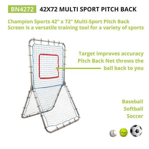 Great for schools, parks and backyards, our Champion Sports 42″W x 72″H Multi-Sport Pitch Back Screen is a versatile training tool for a variety of sports. The practice screen rotates to different angles to help athletes practice catching, throwing and during reaction drills, all with the same piece of equipment. The multi-sport pitch back screen is made with a tough steel frame and durable nylon netting that can endure even the most intense hits with ease, and it has a square target in the middle to help improve accuracy.