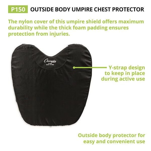 Designed for simple and convenient use, the Champion Sports Outside Body Protector can be thrown on over clothes, making it easy to add an umpire into the game with minimal gear. The nylon cover of this umpire shield offers maximum durability while the thick foam padding ensures protection from injuries. the umpire chest protector features a Y-strap design, allowing a comfortable fit while also keeping the shield in place during active use.