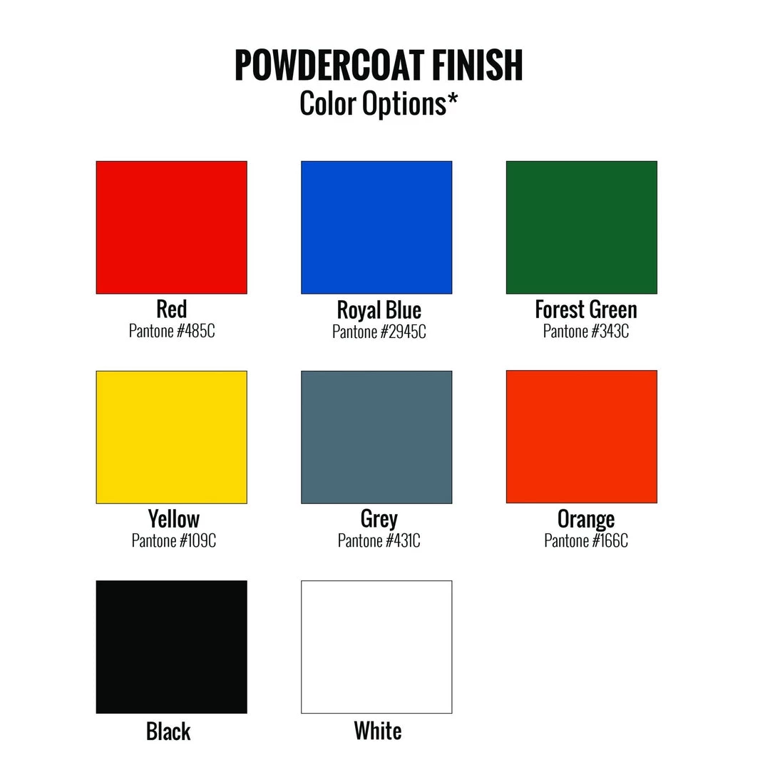 - Powder Coat Finish: Extremely durable baked on finish for an attractive clean appearance. Black and white are standard. Optional colors: Forest Green, Yellow, Orange, Red, Royal Blue, and Grey.