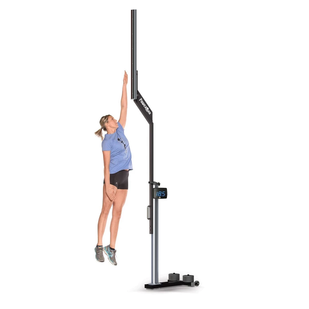- Standing height measuring strip helps establish base height of reach prior to jump.