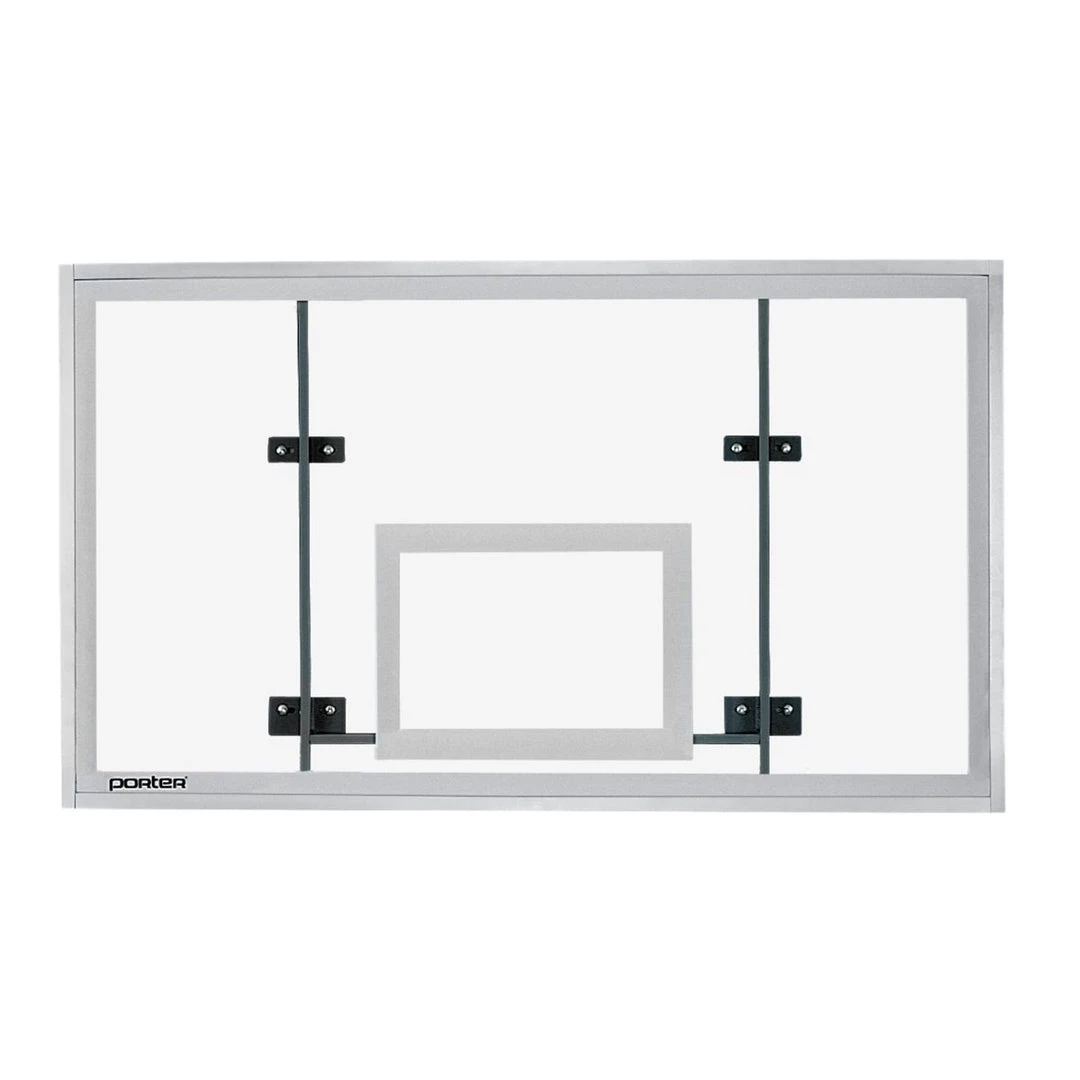 No additional support structure or hardware is needed to replace a standard fan shaped backboard a rectangular glass backboard. The two vertical struts with fan shaped backboard mounting centers include all the necessary hardware. Brushed aluminum extrusions secure ½” thick fully tempered glass to the unitized steel frame. Official white border and target area are fired into the glass. Limited lifetime warranty. Goal mount centers 5” x 4½” and 5″ x 5″. Backboard padding is not included but is recommended for player safety.
