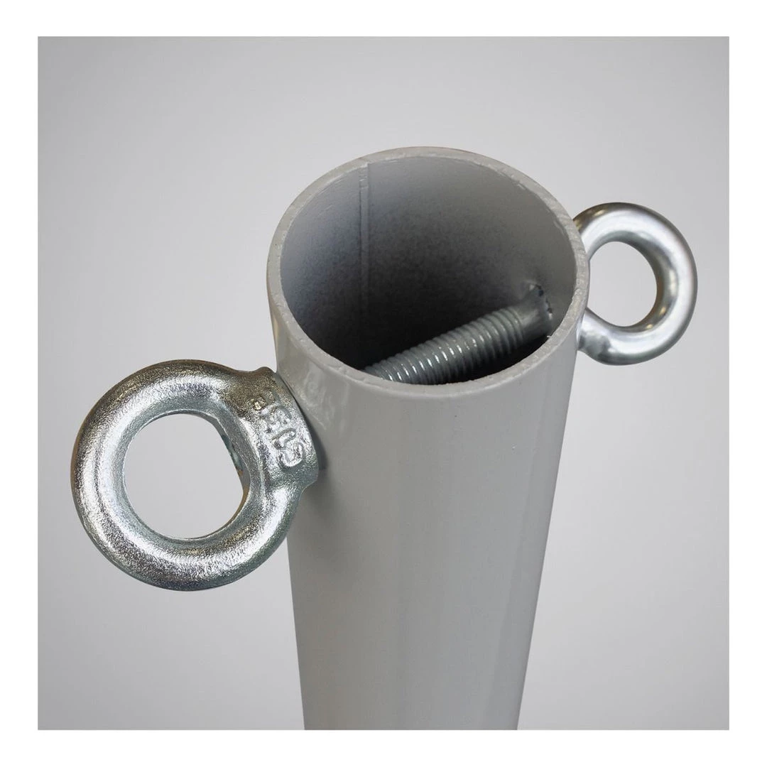 Easy to transport, tip and roll weighted base system for tennis. No installation necessary. Powdercoated steel standard is complete with eye bolts and eye nuts. Non-marking rubber protection ring completely encircles 145 lb domed steel base, preventing standard from sliding and floors from being damaged. Base is powder coated gloss black. Frictionless 3” diameter silent-bearing wheels of non-marking synthetic provide effortless mobility.