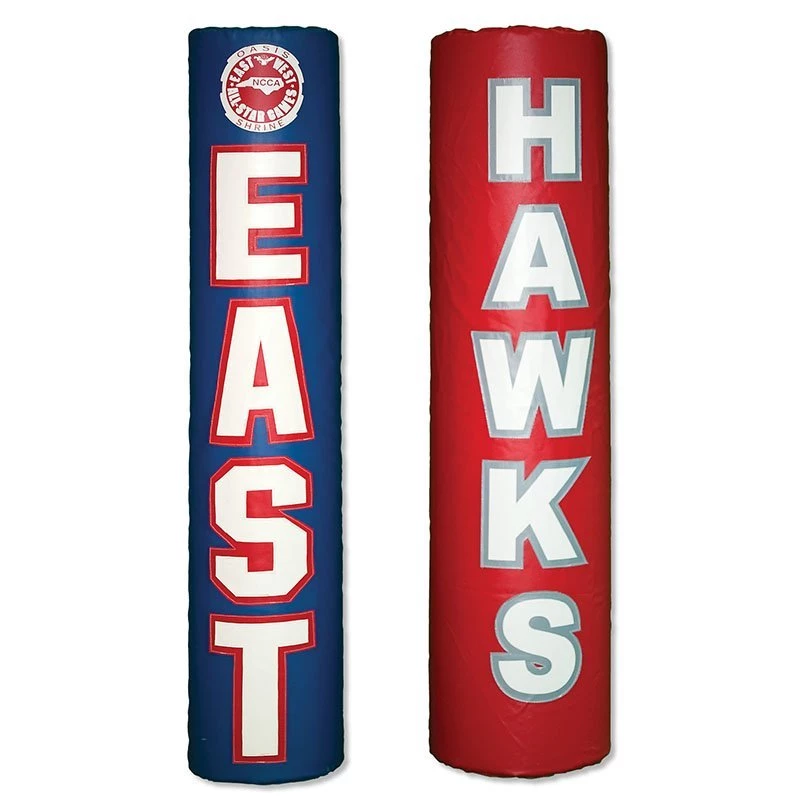 You will not find a better looking and quality Goal Post Pad. Hand sewn letters give the pad a “stand out look” and very strong durability. The Vinyl is 18 oz. vinyl coated nylon with Velcro enclosure. Foam is encased from the goal post and elements (other types of Goal Post pads just protect the exterior of the foam).