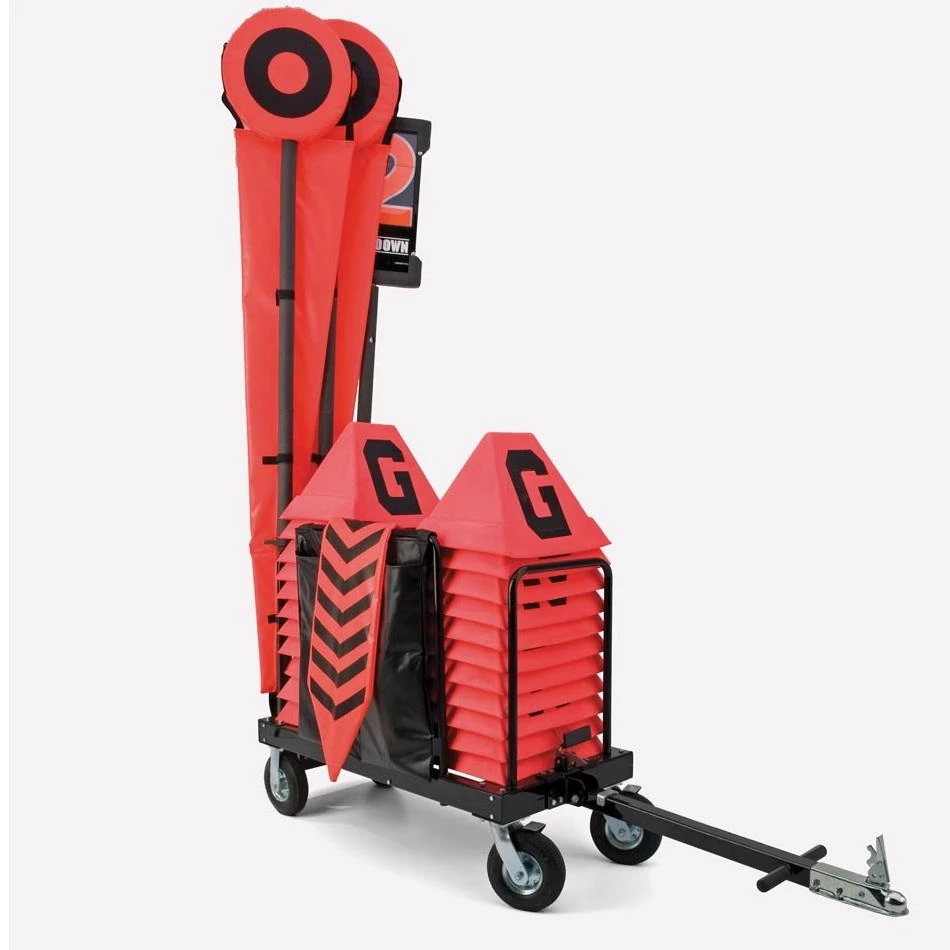 Make field prep a snap and easily transport equipment with the Game Day Trailer. Can be towed behind a motorized field vehicle or pulled by hand using the convenient towing handle. Wheels are foam filled and will never go flat. Store chain sets, pylons and yard line markers securely. A vest bag holds loose items in one place for easy access.