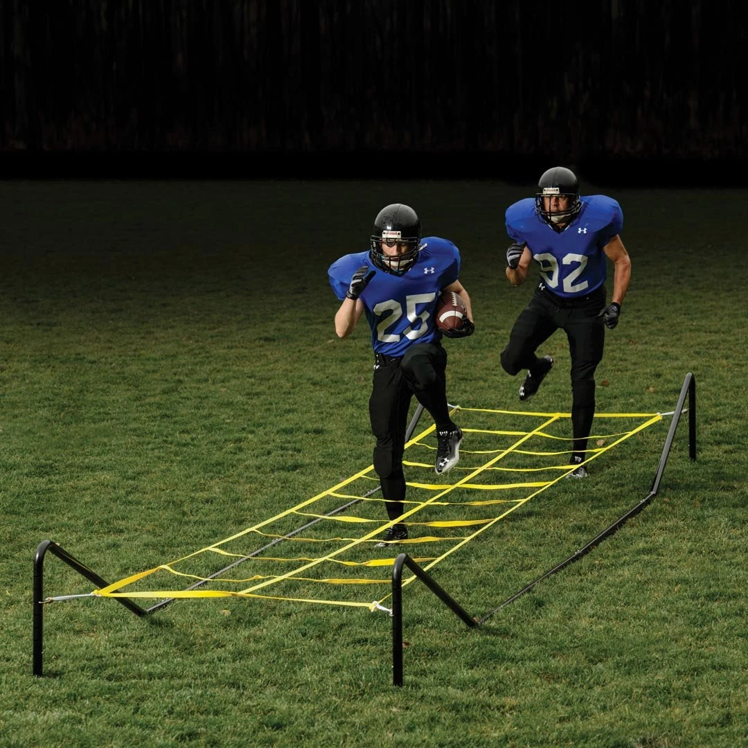 Rogers has enhanced the basic tool to condition and train the hard-driving knee action needed for backs and ends. The webbing easily adjusts in height from 7” to 17.” To reduce potential injury, the safety frame features curved uprights at the corners, flat-channel steel end braces, and no cross braces in the running area. 44”w x 220”l. Can be shipped via UPS.