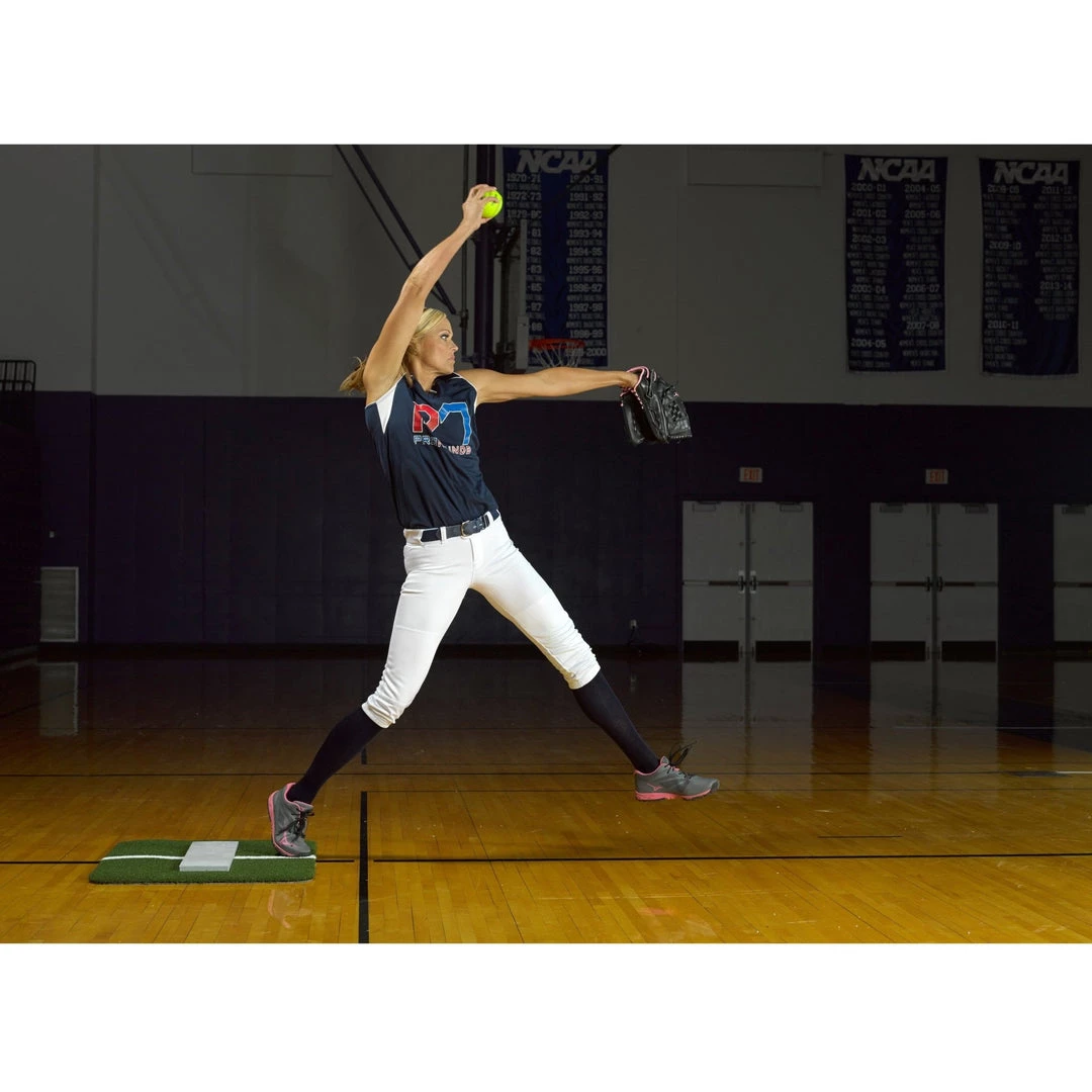 This Jennie Finch Pitching Mini-Mat is an ultra portable 3’W x 2’L turf pitching mat for softball pitching practice. The unique powerline easily aligns with existing gym floor for precise training.