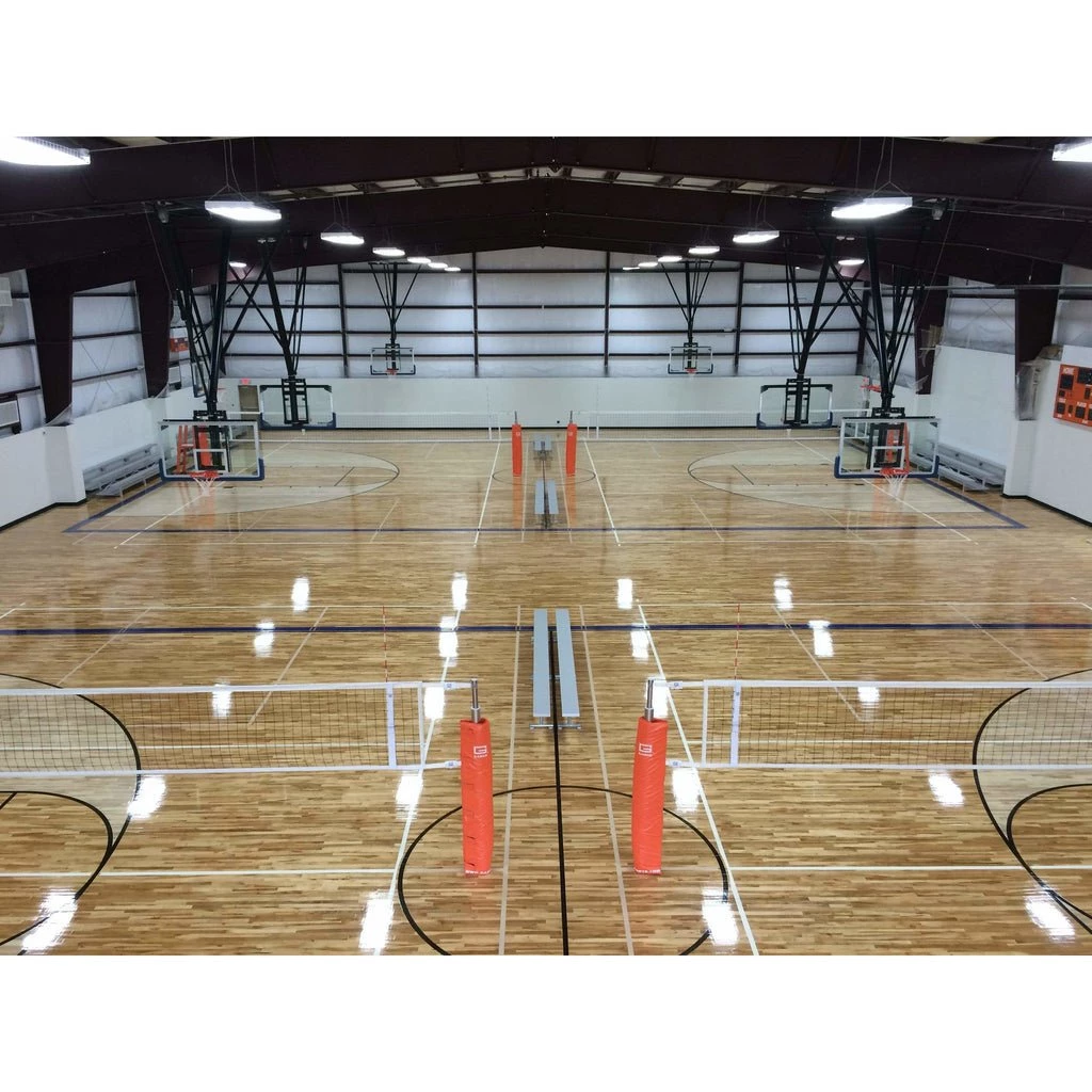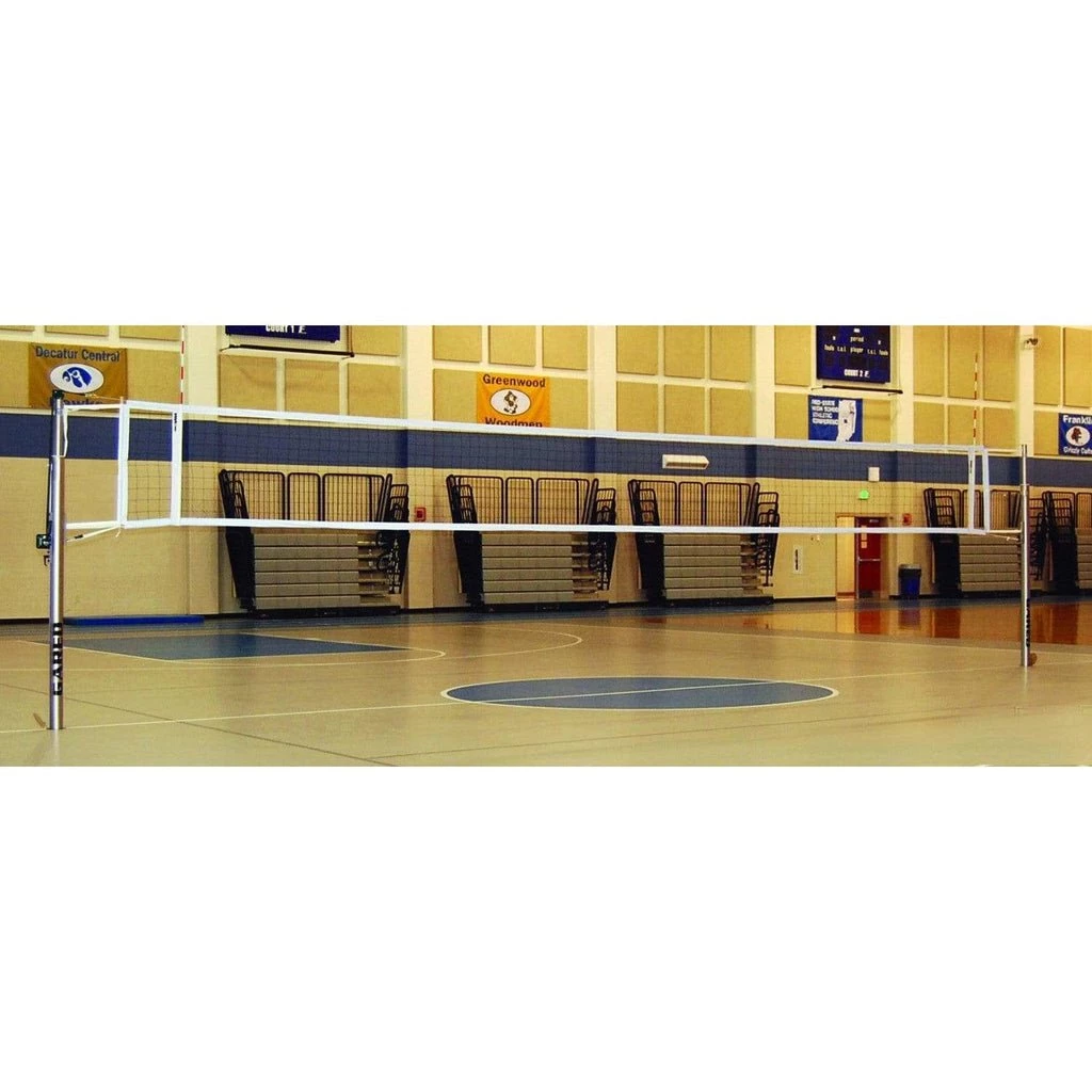 Spike and block yourself to victory with the LIBERO Master Telescopic System. The 7300 one-court system features 4″ telescopic padded aluminum uprights for easy net view for referee. Our competition net, sideline markers and antennas are easily set by sliding rail mechanism intergrated into upright to athlete play level and tightening handled winch. The 4″ floor sleeves and coverplates minimize floor damage and provide optimal stability for the premium system.